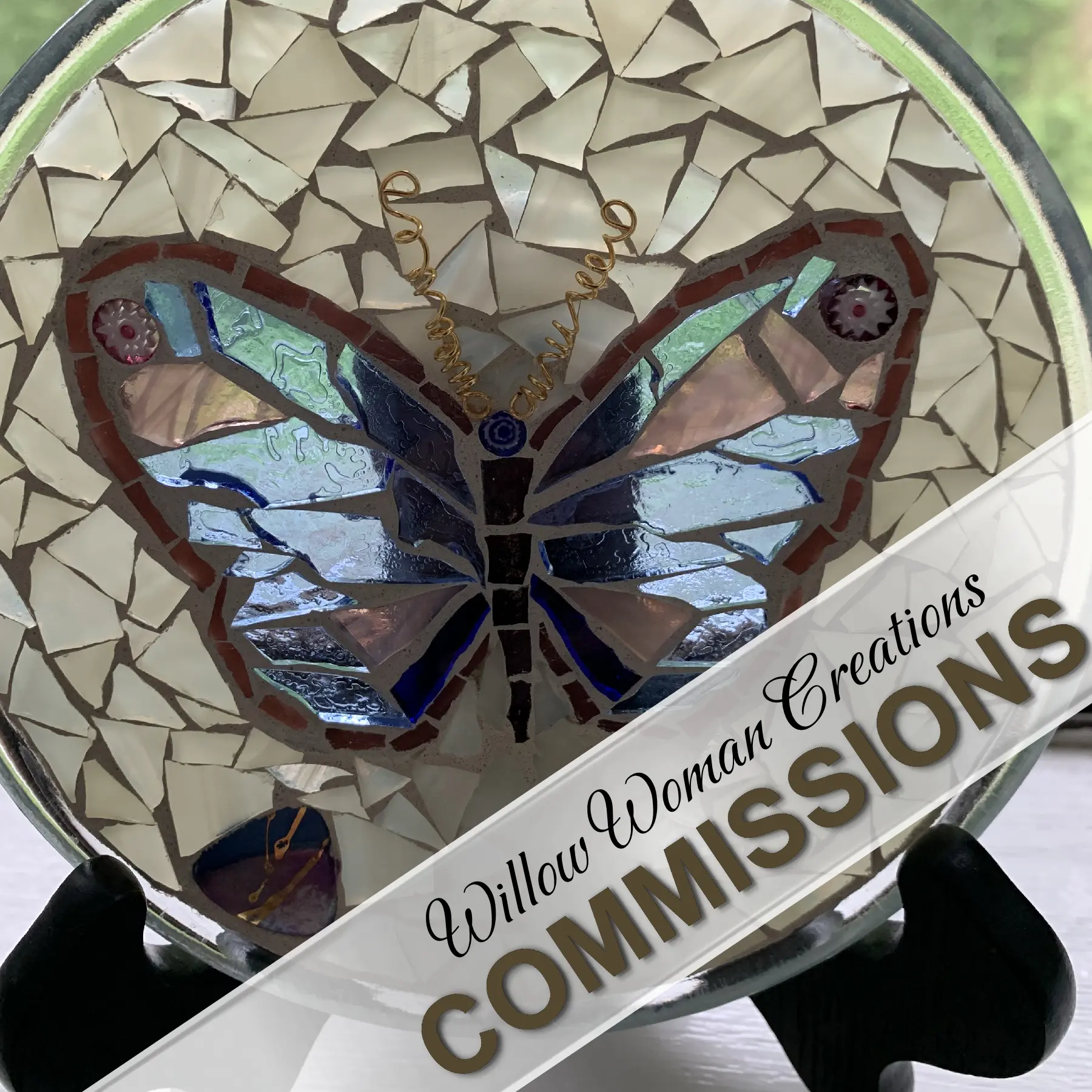 🦋 “Butterfly” is a custom mosaic display plate, handcrafted from glass and reclaimed china. Soft cream tones form the backdrop, allowing the butterfly’s wings to shimmer with hues of lavender, blue, and rose. Intricate glasswork and careful arrangement create the illusion of flight, while subtle accents bring warmth and movement to the design. This commissioned piece embodies the Willow Woman’s love of symbolism and storytelling through craft — the butterfly as a sign of hope, transformation, and delicate strength. Displayed on a stand, it radiates quiet beauty wherever it rests. This original has found its forever home, but similar designs may be commissioned to reflect your own color palette or inspiration.